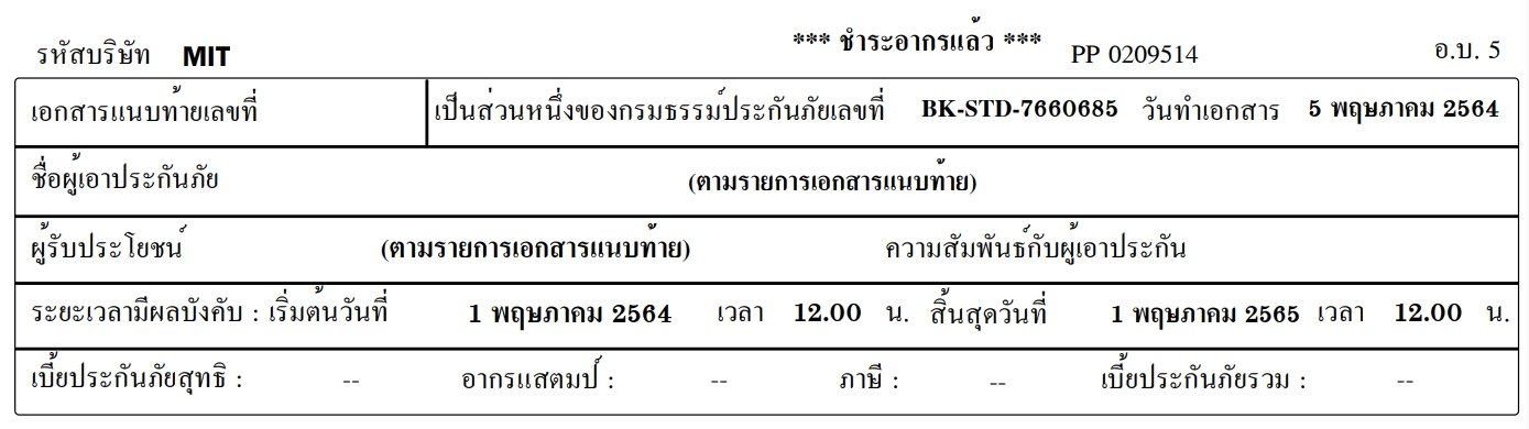 | เบี้ยประกันภัยสุทธิ : -- อากรแสตมป์ : -- ภาษี : -- เบี้ยประกันภัยรวม : -- | |