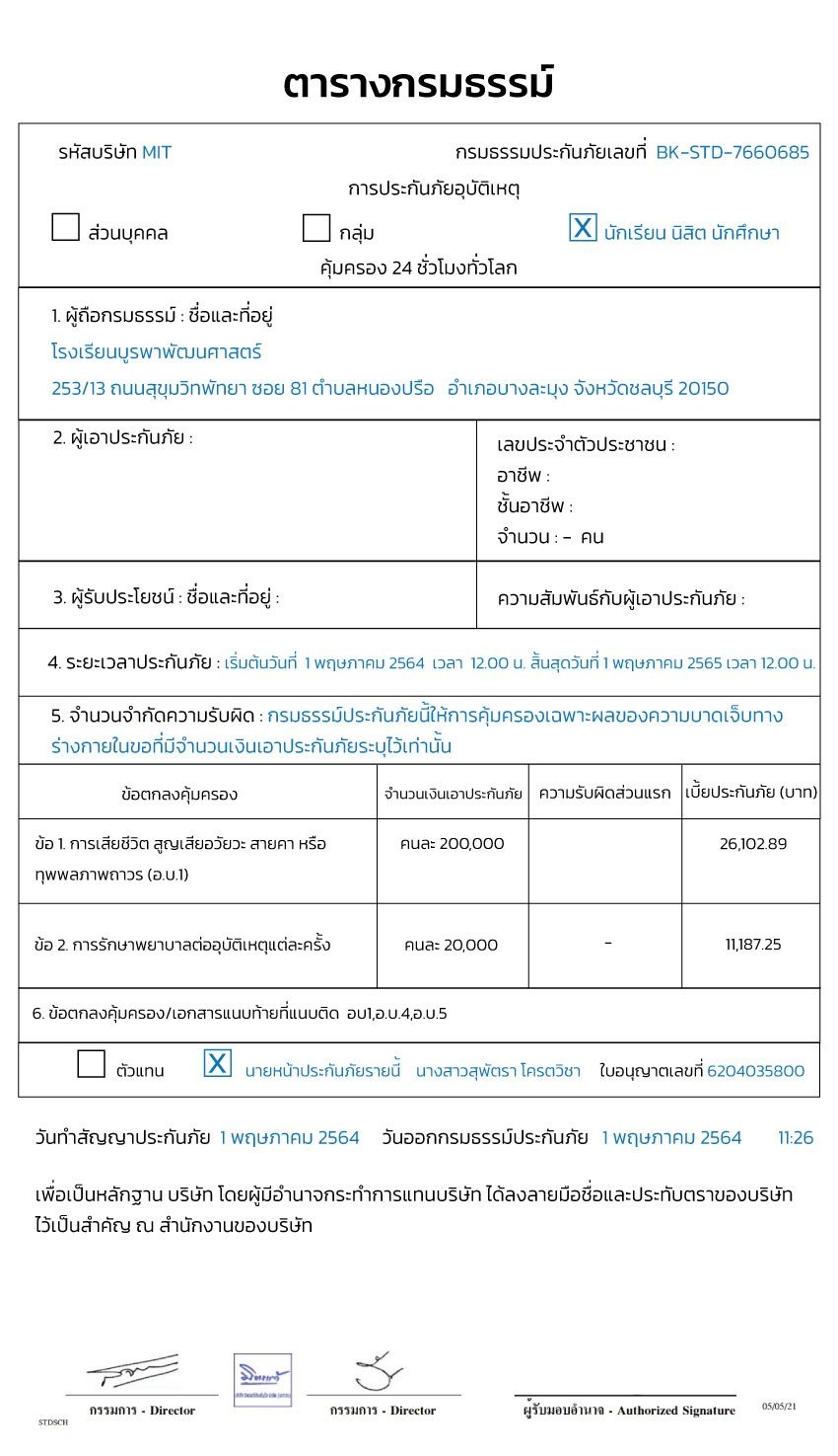 | เอกสารแนบท้ายเลขที่ | เป็นส่วนหนึ่งของกรมธรรม์ประกันภัยเลขที่ BK-STD-7660685 วันทำเอกสาร 5 พฤษภาคม 2564 |